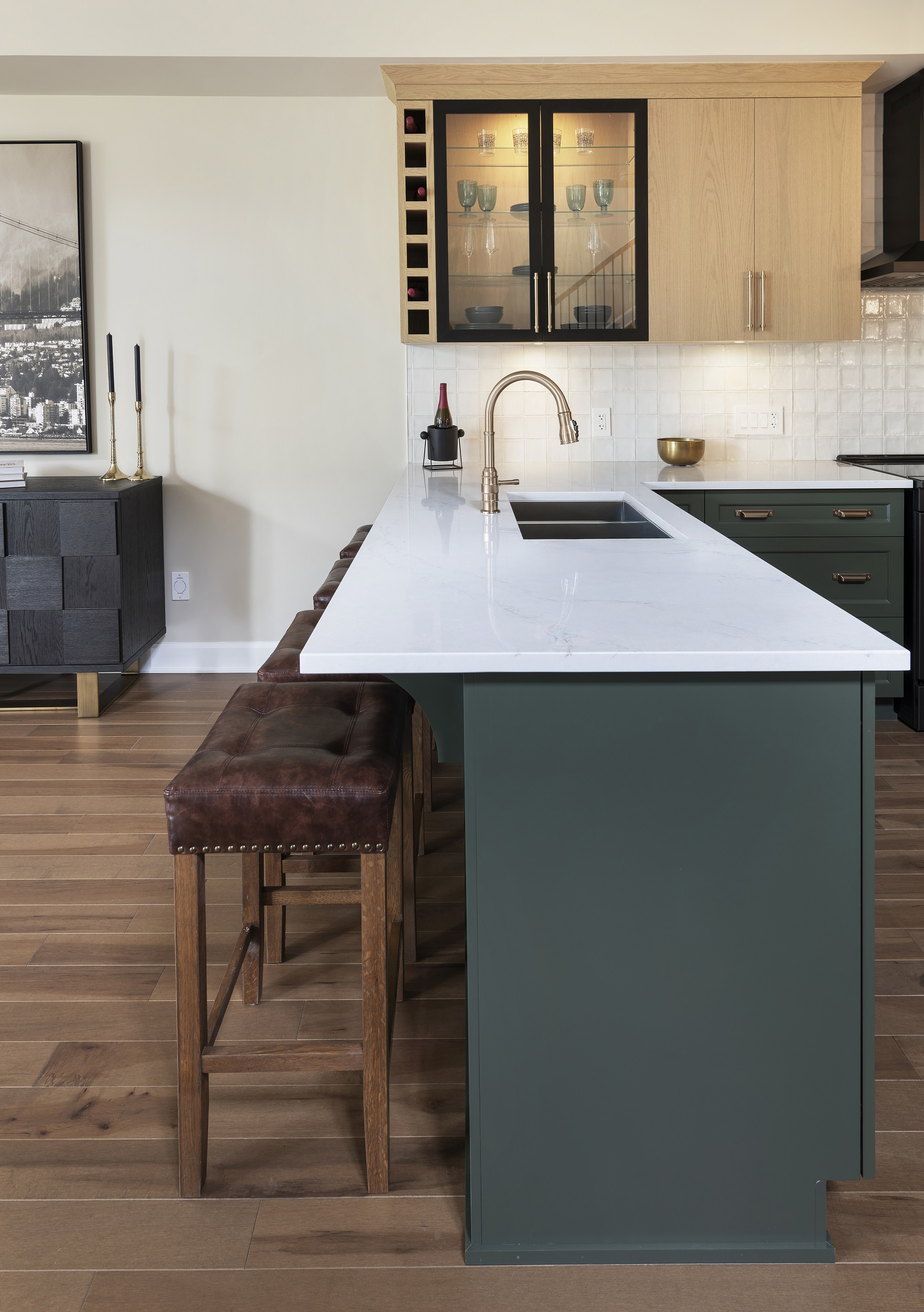 The cabinet to the left of the hood fan features Toledo doors in oak with a Latte stain. The cabinet next to this features doors with black metal door frames and clear glass and glass shelves. To the left of this cabinet is a wine cubby.